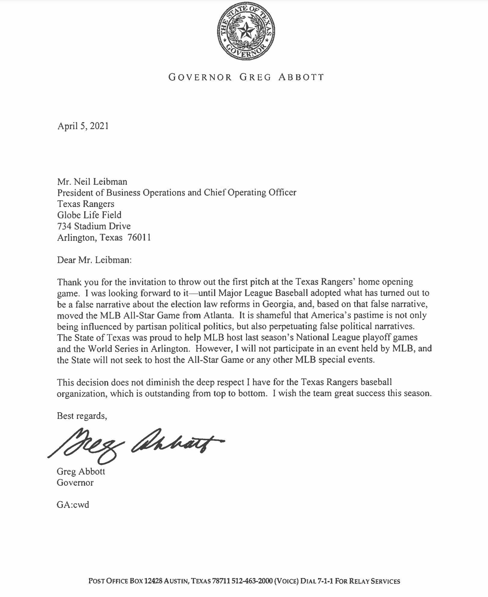 Greg Abbott On Twitter I Was Looking Forward To Throwing Out The First Pitch At The Texas Rangers Home Opening Game Until Mlb Adopted What Has Turned Out To Be A False